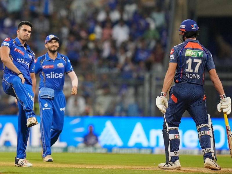 Arjun Tendulkar dismissed Marcus Stoinis in his first over of IPL 2024 but the happiness was short-lived as the decision was overturned by the third umpire during the match between Mumbai Indians and Lucknow Super Giants on Friday. Arjun Tendulkar was included in the MI playing XI for the first time this season as the team management decided to give Jasprit Bumrah some rest. During the second over of the match, Arjun’s delivery crashed into Stoinis’ pads and a loud appeal resulted in the on-field umpire raising his finger. The youngster, who is the son of legendary cricketer Sachin Tendulkar, was ecstatic and he marked the occasion with a celebration made famous by veteran India batter Shikhar Dhawan.