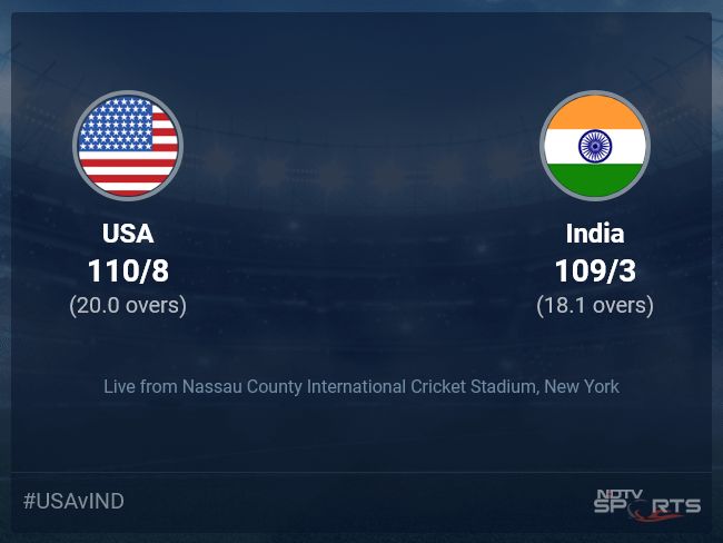 Follow the ICC T20 World Cup 2024 live cricket score on Sports.NDTV.com. After 5.1 overs, India, chasing a target of 111, are 27/2. Get live score, ball by ball commentary and much more. Keep track of ICC T20 World Cup 2024 today match between USA and India. Everything related to USA and India match will be available on Sports.NDTV.com. Stay updated with USA vs India live score. Do check for USA vs India scorecard. You can get scorecard updates, match related facts. Get quick live updates with ads, Sports.NDTV.com, which is the perfect destination for live cricket score.