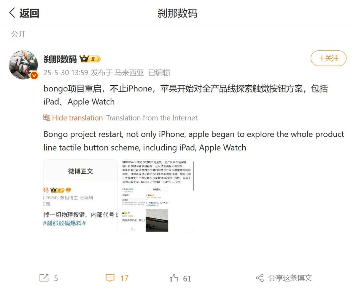 A tipster known as Instant Digital (translated from Chinese) states in a Weibo post that Apple is working on bringing haptic buttons to its “whole product line”. The leaker previously claimed that the company had restarted work on its Project Bongo initiative, and has now claimed that Apple is exploring the addition of tactile buttons on the iPad and the Apple Watch.