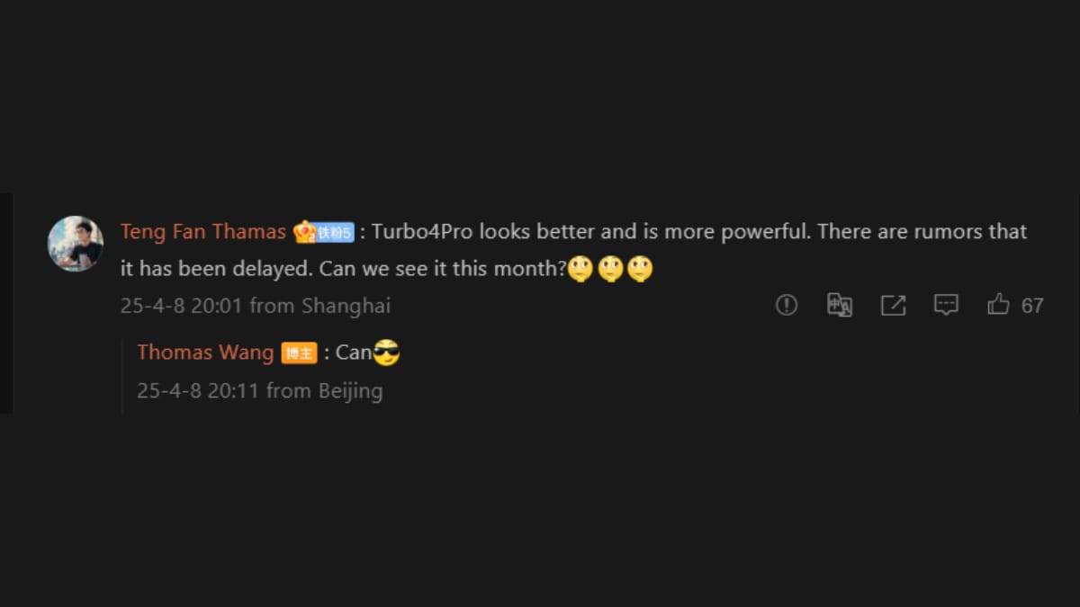 Although Wang did not explicitly mention the name of the smartphone, his reply to user comments on his original post suggests that the phone is the anticipated Redmi Turbo 4 Pro and it may launch in China in April. A Weibo user commented “Turbo 4 Pro looks better (translated from Chinese)” and asked if it could be expected “this month.” Wang responded to this in the affirmative.redmi turbo 4 pro launch weibo thomas wang inline thomas wang