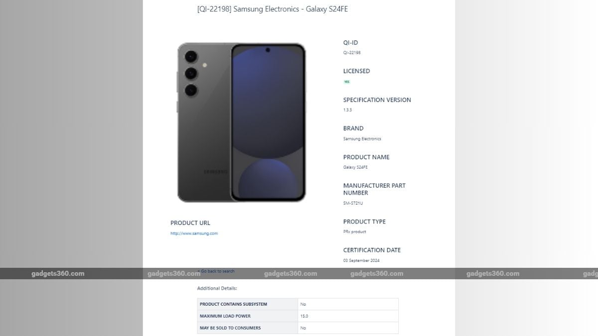 First spotted by 91Mobiles, the WPC database features a listing for the Samsung Galaxy S24 FE with the model number SM-S721U, which has been hinted at in previous leaks. When launched, the purported smartphone is said to support a “maximum load power” of 15.0W.