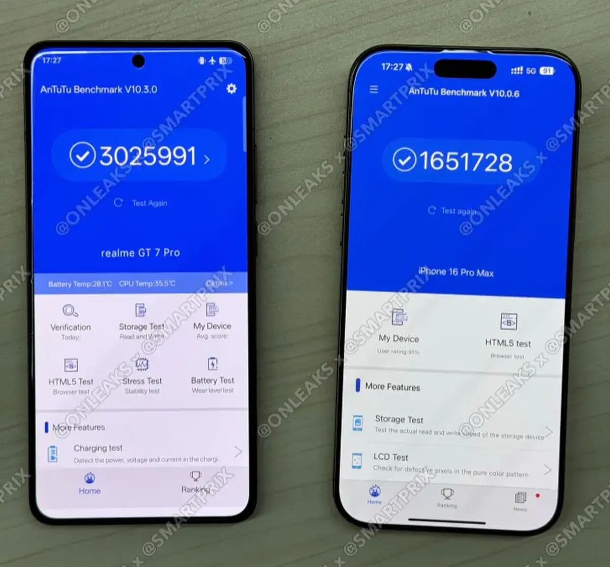 Realme GT 7 Pro benchmarked (left) alongside the iPhone 16 Pro Max